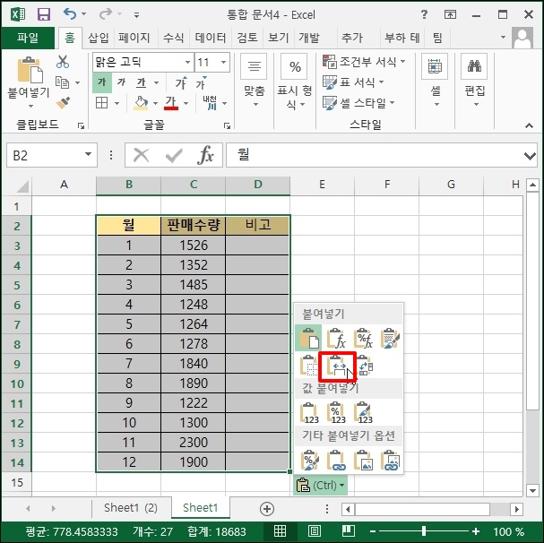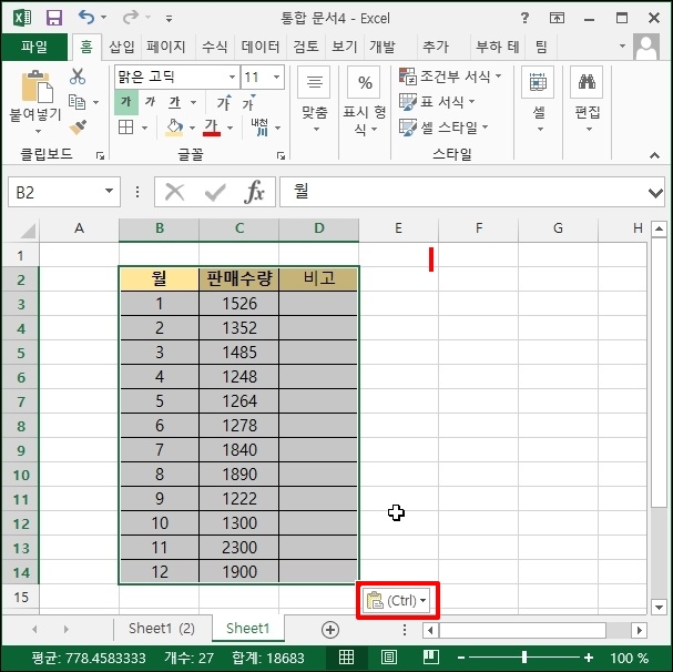 붙여넣기 된 표 우측 하단을 보시면(Ctrl) 메뉴가 있습니다. 클릭해주세요.