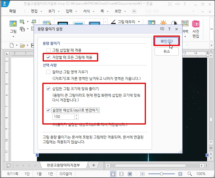 [설정한 해상도(DPI)로 변경하기]에 체크합니다. 값은 150 정도를 입력 후 상단 [확인] 버튼을 클릭합니다.