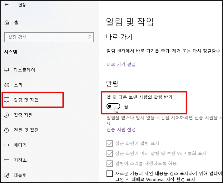 우측 알림 및 작업에서 [앱 및 다른 보낸 사람의 알림 받기]를 "끔" 으로 합니다.