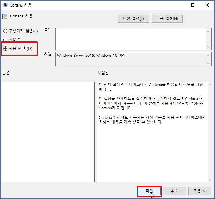 우측에 [Cortana 허용]이 있는데 더블클릭합니다.