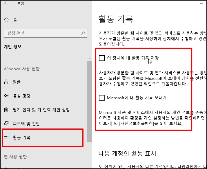 좌측 메뉴 중 [활동 기록]을 클릭 후 우측 기능을 모두 체크 해제합니다.