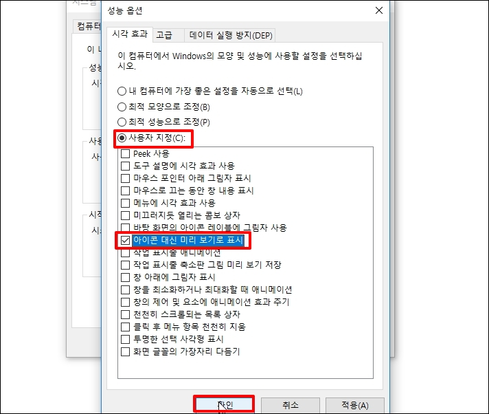 성능 옵션 창이 열리면 [최적 성능으로 조정] 사용자 지정을 선택 후 [아이콘 대신 미리 보기로 표시]를 제외하고