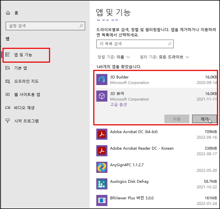 앱 및 기능이 나오는데요. 사용하지 않는 프로그램을 선택 후 [제거] 합니다.