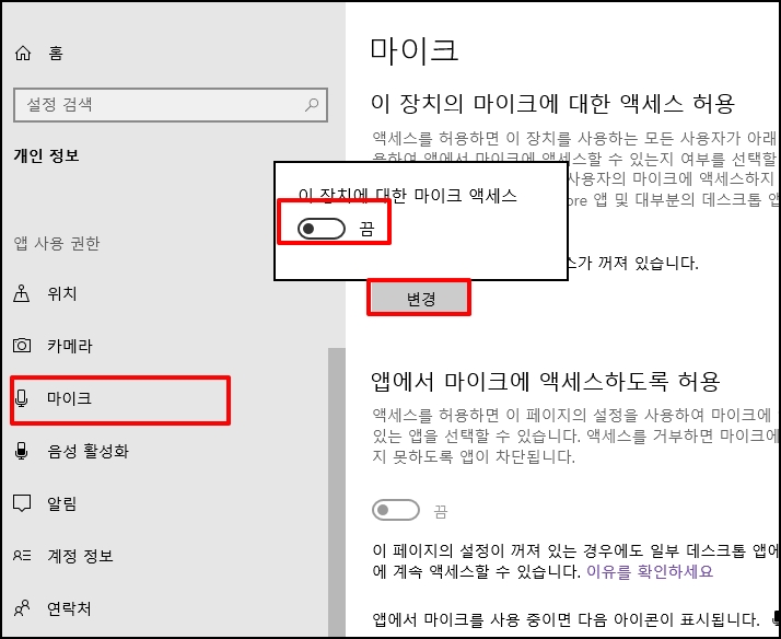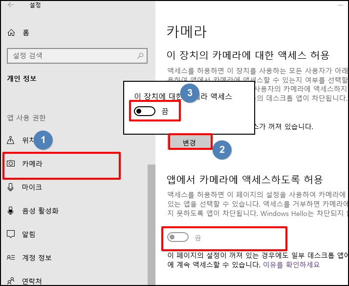 [카메라]를 선택 후 이 장치의 카메라 기능을 끄기 위해 [변경] 버튼을 클릭 후 장치를 "끔"으로 합니다.