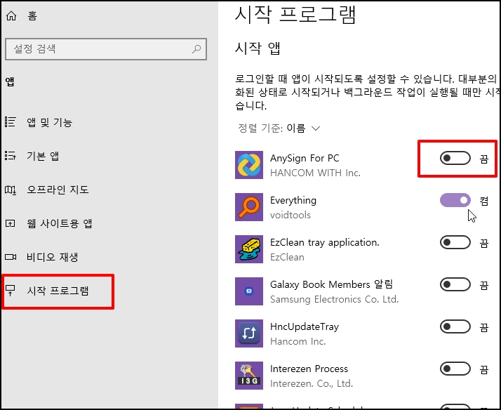 좌측 메뉴 중 [시작 프로그램] 선택 후 불필요한 프로그램을 "끔"으로 합니다.