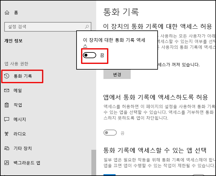 좌측 메뉴 중 [통화 기록]을 선택 후 통화기록 [변경] 버튼을 클릭해서 통화 기록 액세스를 "끔"으로 합니다.