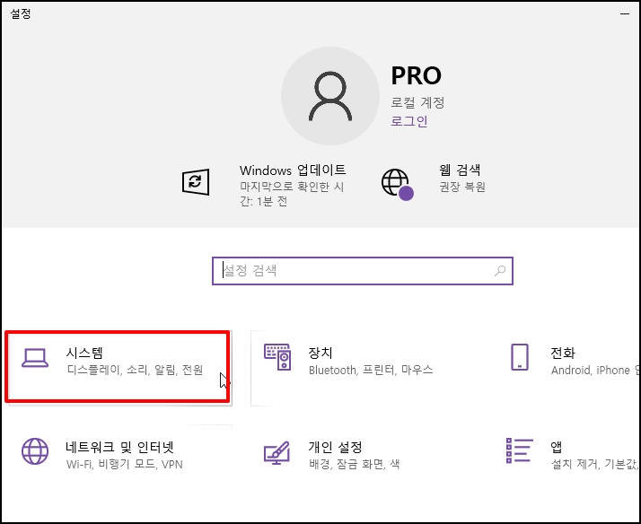 Windows 설정 창이 열리면 [시스템]을 선택해주세요