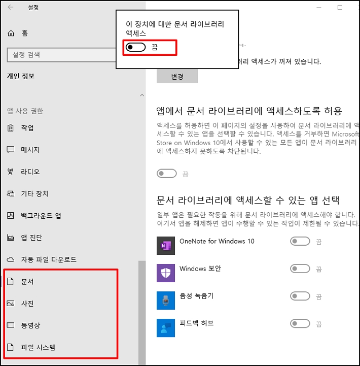 문서 , 사진, 동영상, 파일 시스템 메뉴가 나오는데요. 탐색기 내문서, 내 사진 등의 폴더 기능입니다. 사용하지 않는 기능을 꺼주세요