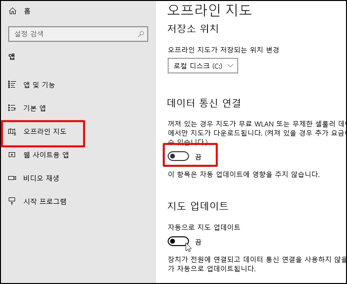 좌측 메뉴 중 [오프라인 지도]를 업데이트에를측 지도 업데이트에 [자동으로 지도 업데이트]를 "끔"으로 합니다.