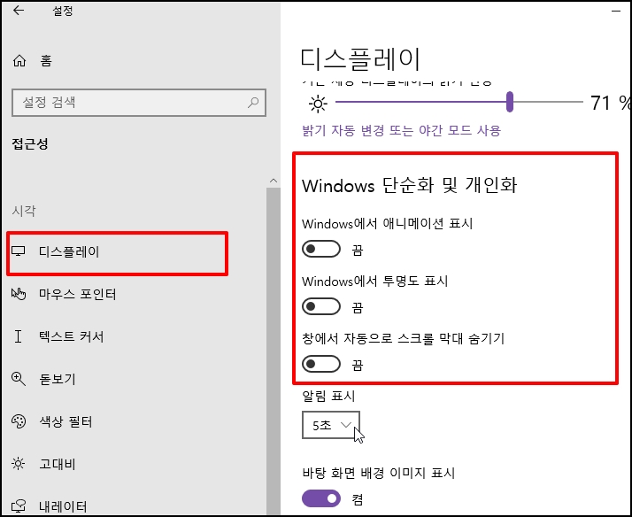 좌측 메뉴 중 디스플레이 선택 후 Windows 단순화 및 개인화를 아래 이미지와 같이 설정합니다.