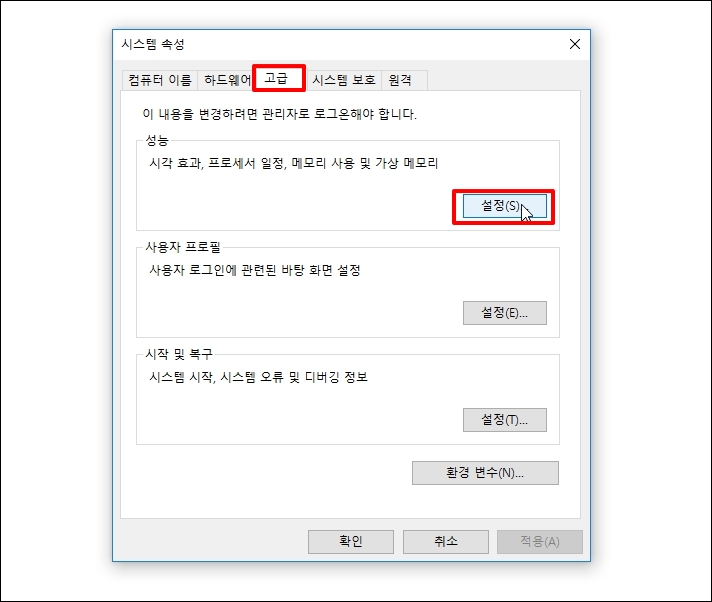 시스템 속성 창이 열리는데요. 상단 [고급] 탭을 선택 후 성능 항목에 [설정] 버튼을 클릭합니다.