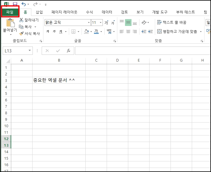 엑셀 실행 후 상단 메뉴 중 [파일]을 선택합니다.
