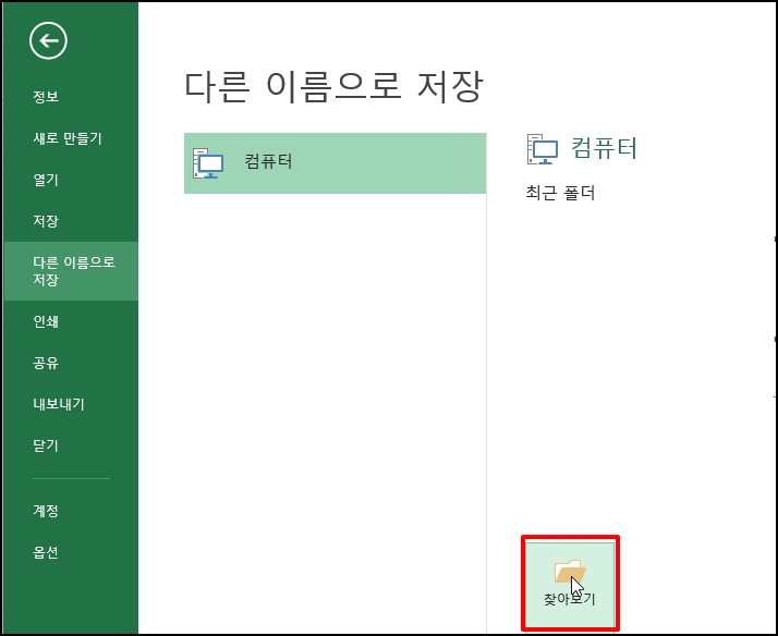 다른 이름으로 저장 화면이 나오면 [찾아보기] 버튼을 클릭합니다.