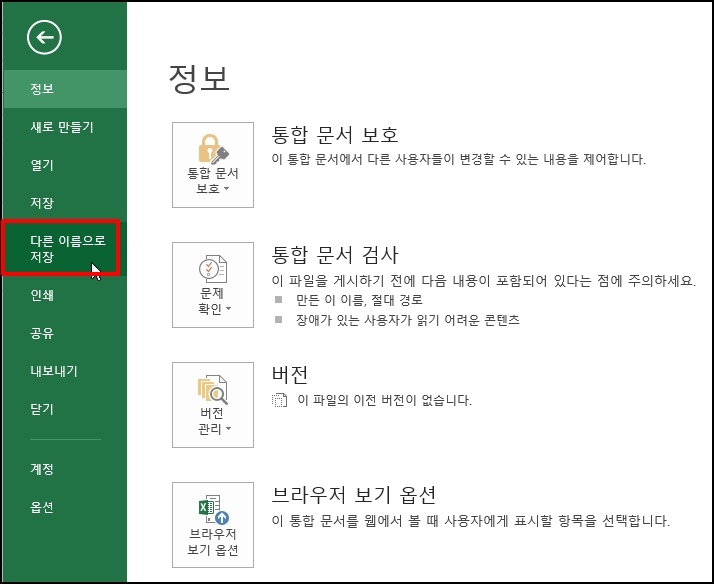 파일 화면으로 이동하면 좌측 메뉴 중 [다른 이름으로 저장]을 선택합니다.