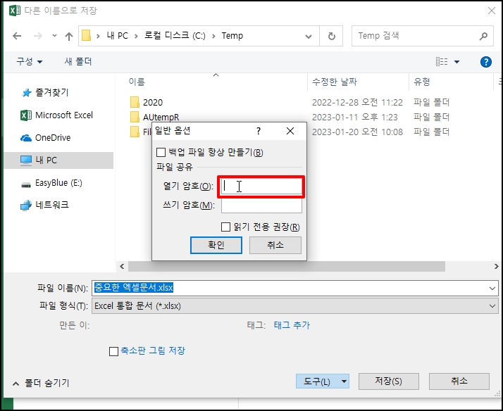 일반 옵션 창이 열리면 열기 암호를 입력하라고 나옵니다.
