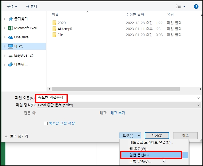 저장 창이 나오면 [일반 옵션]을 선택 후 읽기 암호 제거 후 [확인] 버튼을 클릭 후 문서를 저장 하시면 됩니다.