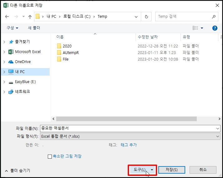 다른 이름으로 저장 창이 열리면 저장할 파일 이름을 입력 후 창 하단에 [도구]를 선택합니다.