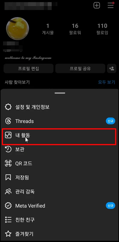 하단에 메뉴가 나오는데요. 메뉴 중 [내 활동]을 선택합니다.
