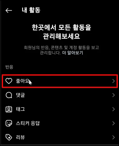 이 화면에서 좋아요, 댓글, 태그 등 모든 게시물을 한번에 조회할 수 있는데요 [좋아요]를 선택합니다.
