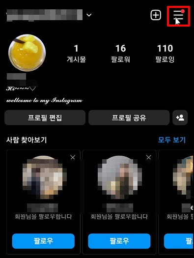 내 피드가 나오는데요. 게시물과 팔로워 수를 확인할 수 있습니다. 우측 상단 선 3개의 더 보기 메뉴를 선택합니다.